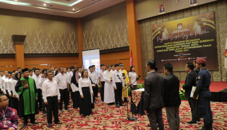 Pelantikan dan pengambilan sumpah/janji sebanyak 85 anggota Panitia Pemilihan Kecamatan (PPK), dilaksanakan di Palace Ballroom Aquarius Boutique Hotel Sampit, Kamis (16/05/2024).