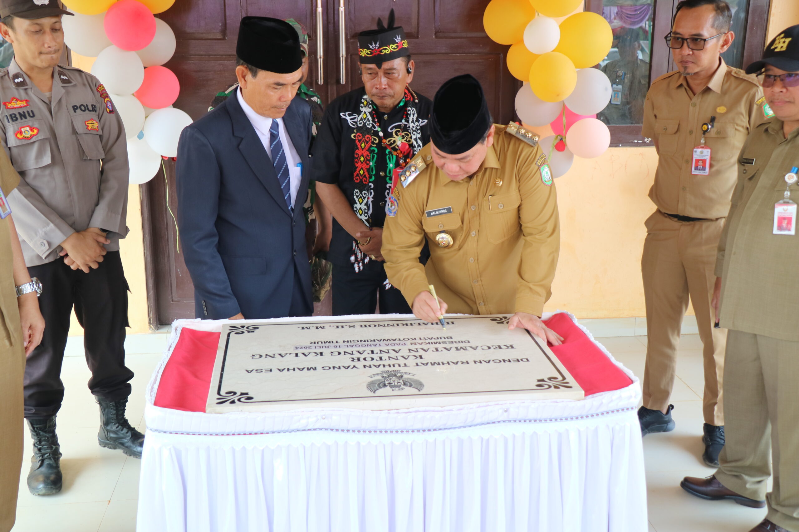 Bupati Kotawaringin Timur (kotim), H. Halikinnor,SH.,MM meresmikan Gedung Kantor Kecamatan Antang Kalang yang terletak di Desa Tumbang Kalang, pada hari Selasa (16/07/2024). Peresmian tersebut ditandai dengan Penandatanganan Prasasti dan pengguntingan pita oleh Bupati.