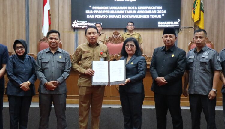 Bupati Kotawaringin Timur (Kotim), yang diwakili oleh Sekretaris Daerah (Sekda) Kotim H.Fajrurrahman, baru saja melakukan penandatanganan Nota Kesepakatan atas Perubahan Kebijakan Umum Anggaran (KUA) dan Prioritas Plafon Anggaran Sementara (PPAS) Tahun Anggaran 2024. Penandatanganan tersebut dilaksanakan dalam Rapat Paripurna ke-19 Masa Persidangan II Tahun Sidang 2024 Dewan Perwakilan Rakyat Daerah (DPRD) Kabupaten Kotawaringin Timur.