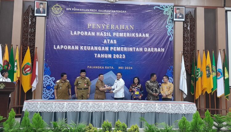 Bupati Kotim H. Halikinnor,SH.,M.M didampingi Ketua DPRD Kotim Dra. Rinie Enderson Menerima langsung  Laporan Hasil Pemeriksaan atas Laporan Keuangan Pemerintah Kab. Kotim Tahun 2023 dari Badan Pemeriksa Keuangan Perwakilan (BPK) Kalimantan Tengah (kalteng) yang langsung diserahkan oleh Kepala BPK RI  Perwakilan Kalteng  M. Ali Asyar, S.E., Ak., CA., CSFA., CFrA.